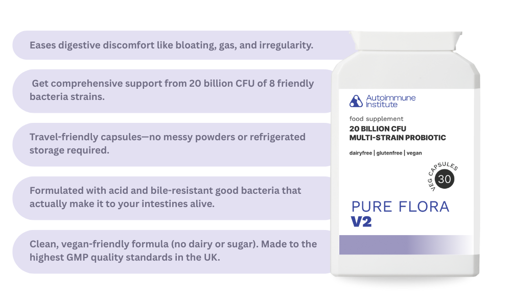Pure Flora V2 is ideal for those experiencing digestive discomfort, taking or recovering from antibiotics, travelling abroad, or simply looking to support long-term gut health.