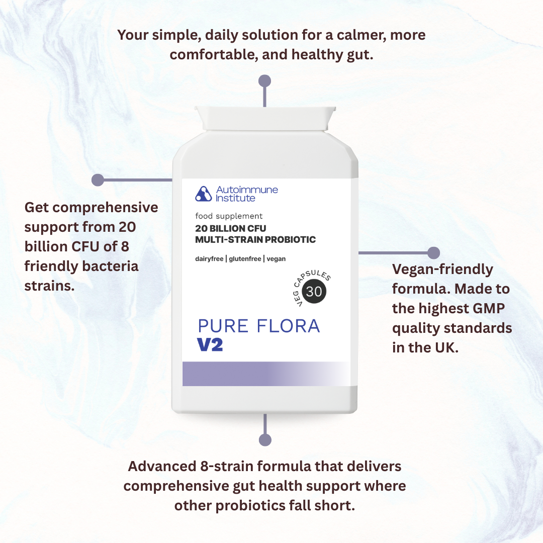 Pure Flora V2 is a high-strength probiotic supplement containing 8 strains of friendly bacteria, designed to support gut health, digestion, and immune balance.