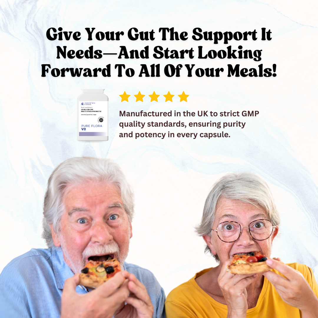 Stop declining dinner invitations or feeling anxious about eating out. Pure Flora V2 gives you the confidence to eat normally without worrying about the embarrassing loud gurgles and rumbles.