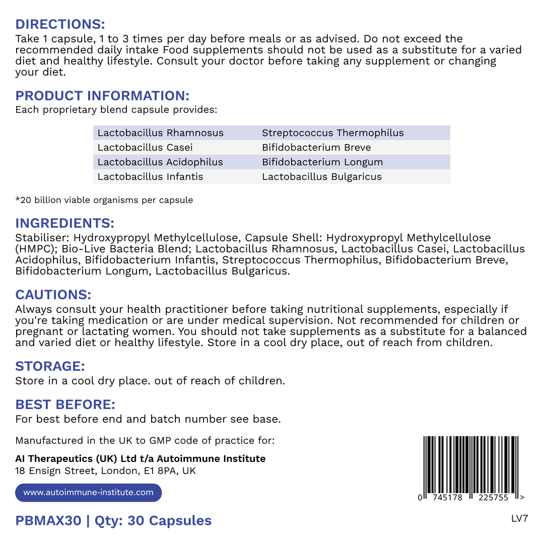 Each capsule contains 8 probiotic strains delivering 20 billion CFU: